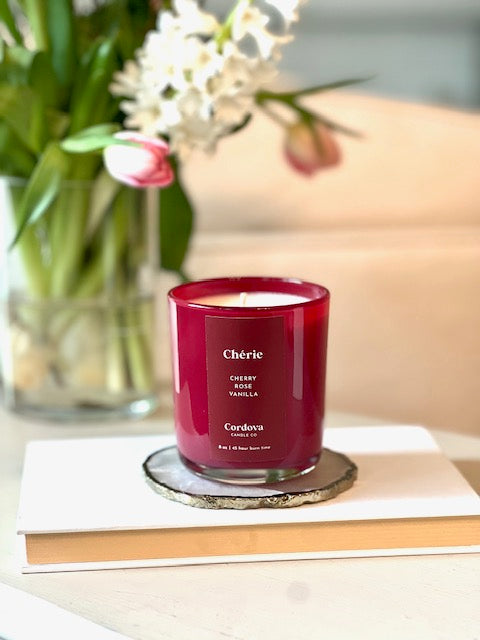 Hand poured in a stunning red glossy vessel.