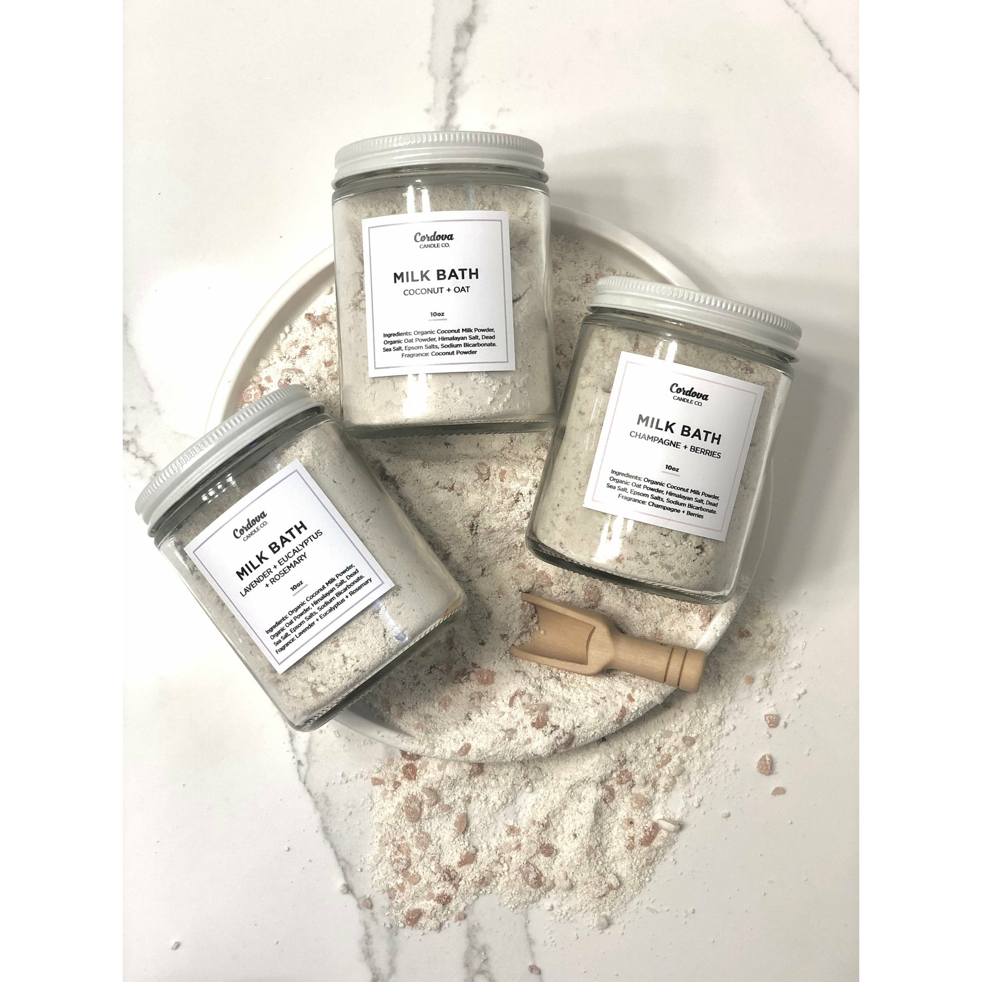 Ingredients: Organic Coconut Milk Powder, Organic Oat Powder, Himalayan Pink Salt, Dead Sea Salt, Epsom Salts, Sodium Bicarbonate, Coconut Powder and lightly infused with Phthalate & Paraben free fragrances.